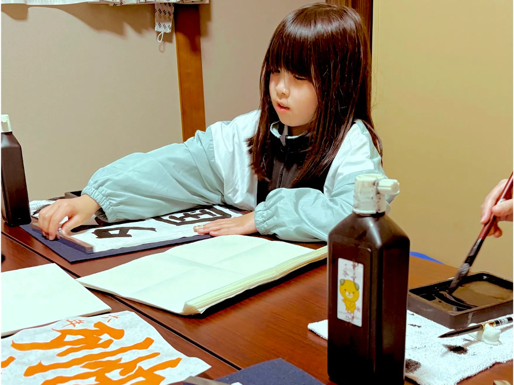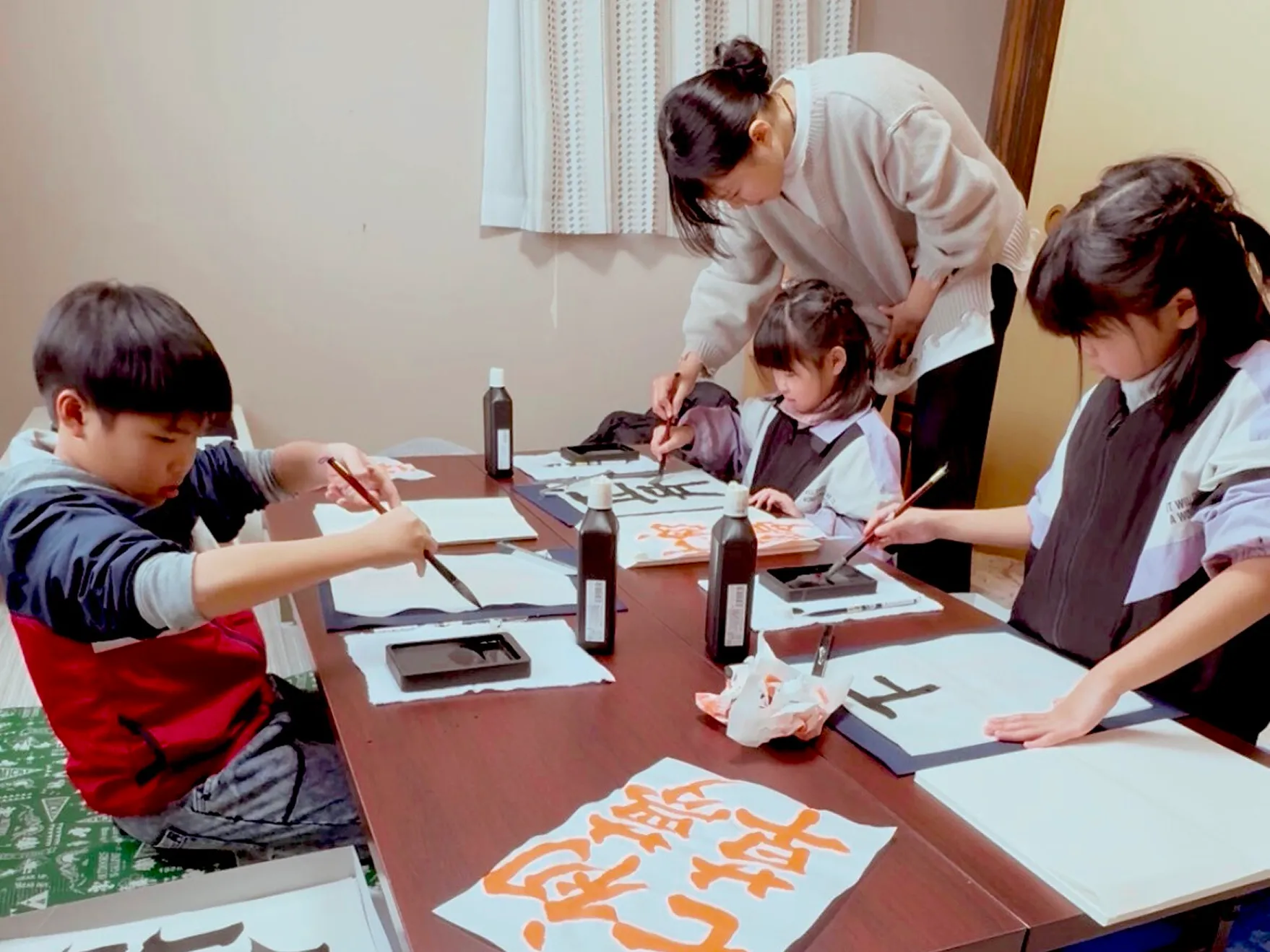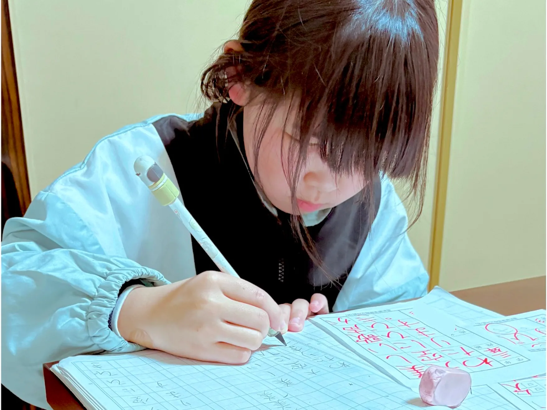 お友達と一緒に学ぶ中で、楽しく取り組める雰囲気を大切にしています。レッスン時間は1時間~1時間半を目安にしており、無理なく進めます。通っているうちに、少しずつ集中して書く力が自然と身についていきます。